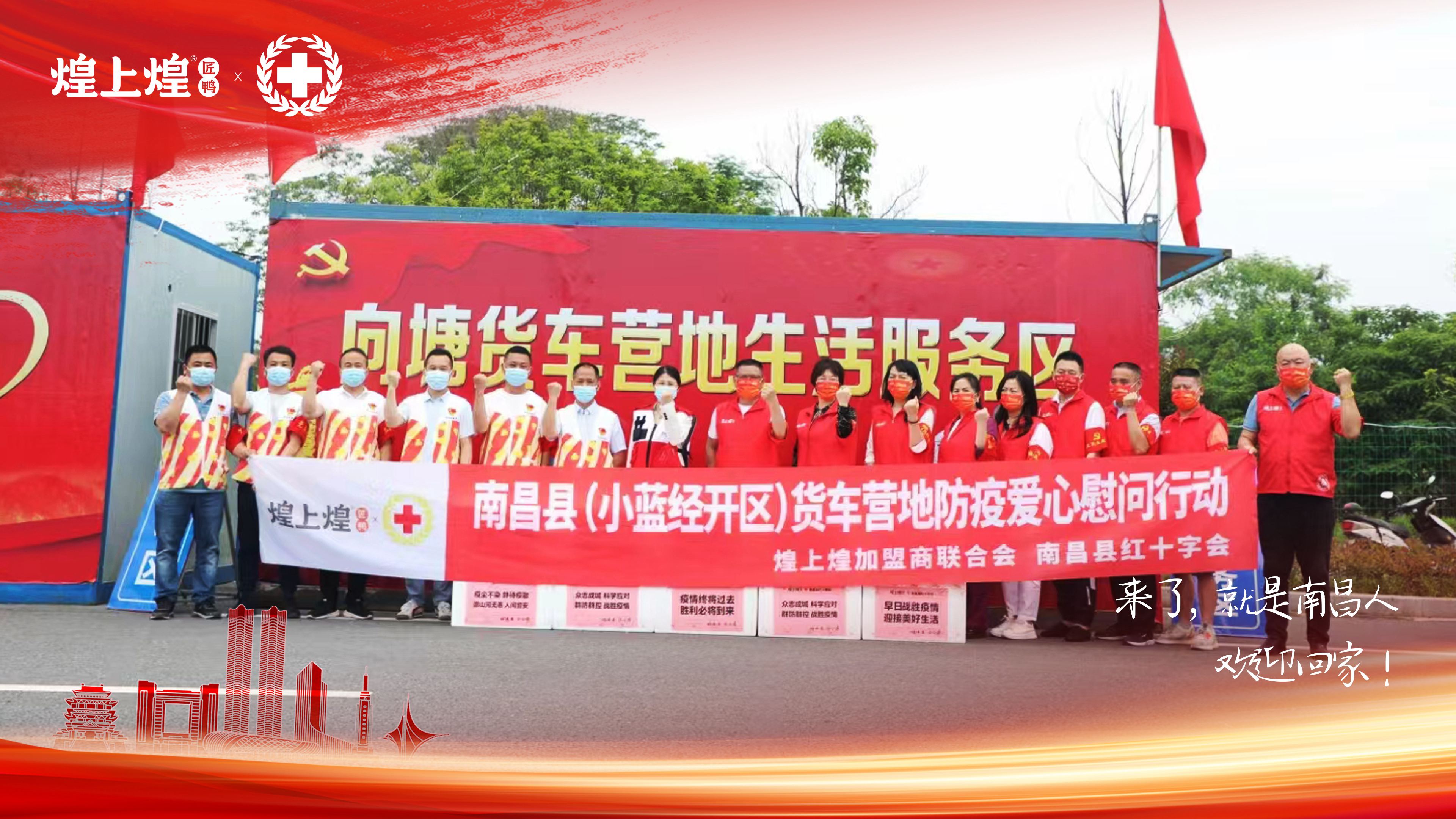 5月7日,在江西省南昌縣(小藍經開區)各個貨車營地,煌上煌加盟商聯合會攜手南昌縣紅十字會給駐守營地的工作人員、志愿者,以及暫時停留在南昌等待核酸檢測結果的司機們送上煌味能量。