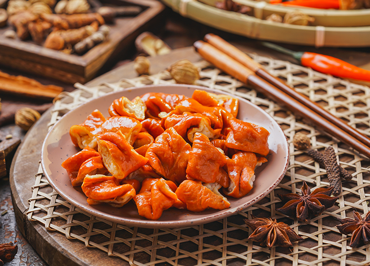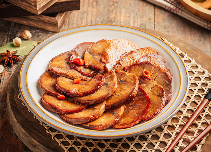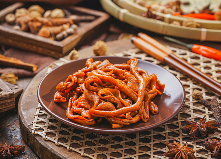 精選牛肚去除筋膜,預(yù)煮烹調(diào)去腥膻氣味。采用20多種中藥和香辛料濃...