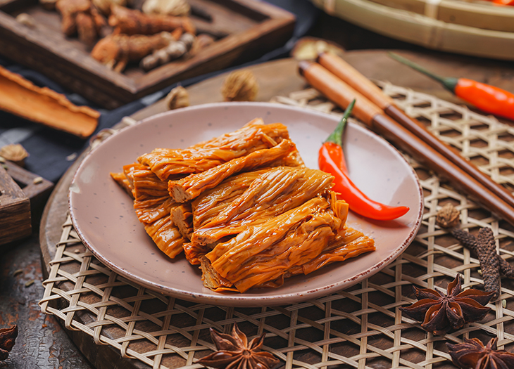 精選高安產(chǎn)特級腐竹,經(jīng)浸泡、濃湯鹵制而成。產(chǎn)品色澤金黃,包含鹵...