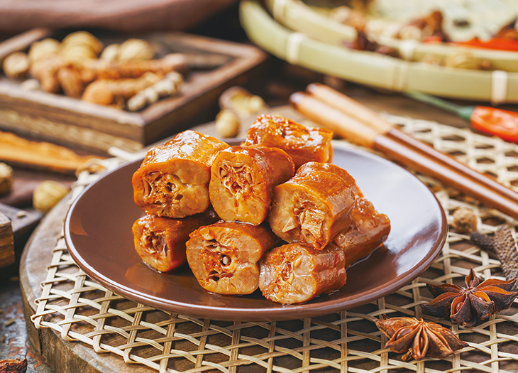 精選一指寬以上的新鮮鴨腸,洗凈胃腸容物,腌制增脆,鹵湯灼鹵。產(chǎn)...