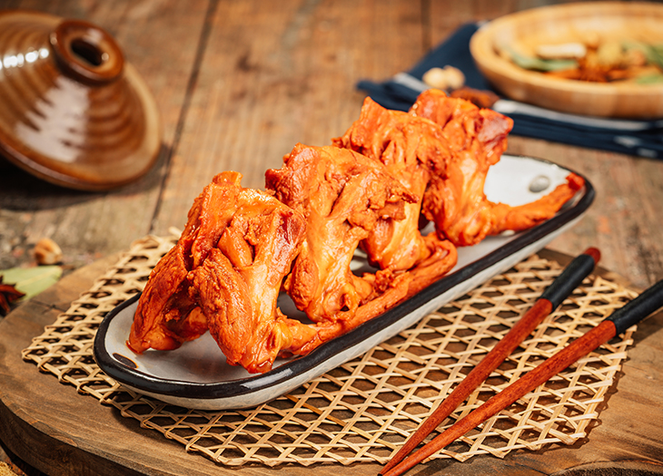 精選規(guī)格統(tǒng)一的鴨鎖骨,濃湯鹵制,使用多種調(diào)味料、紅油拌制調(diào)理,...