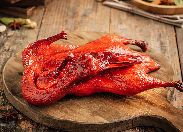 精選1000克左右的鮮凍白條鴨,摘凈殘毛和內(nèi)腔異物,采用多種調(diào)味料...